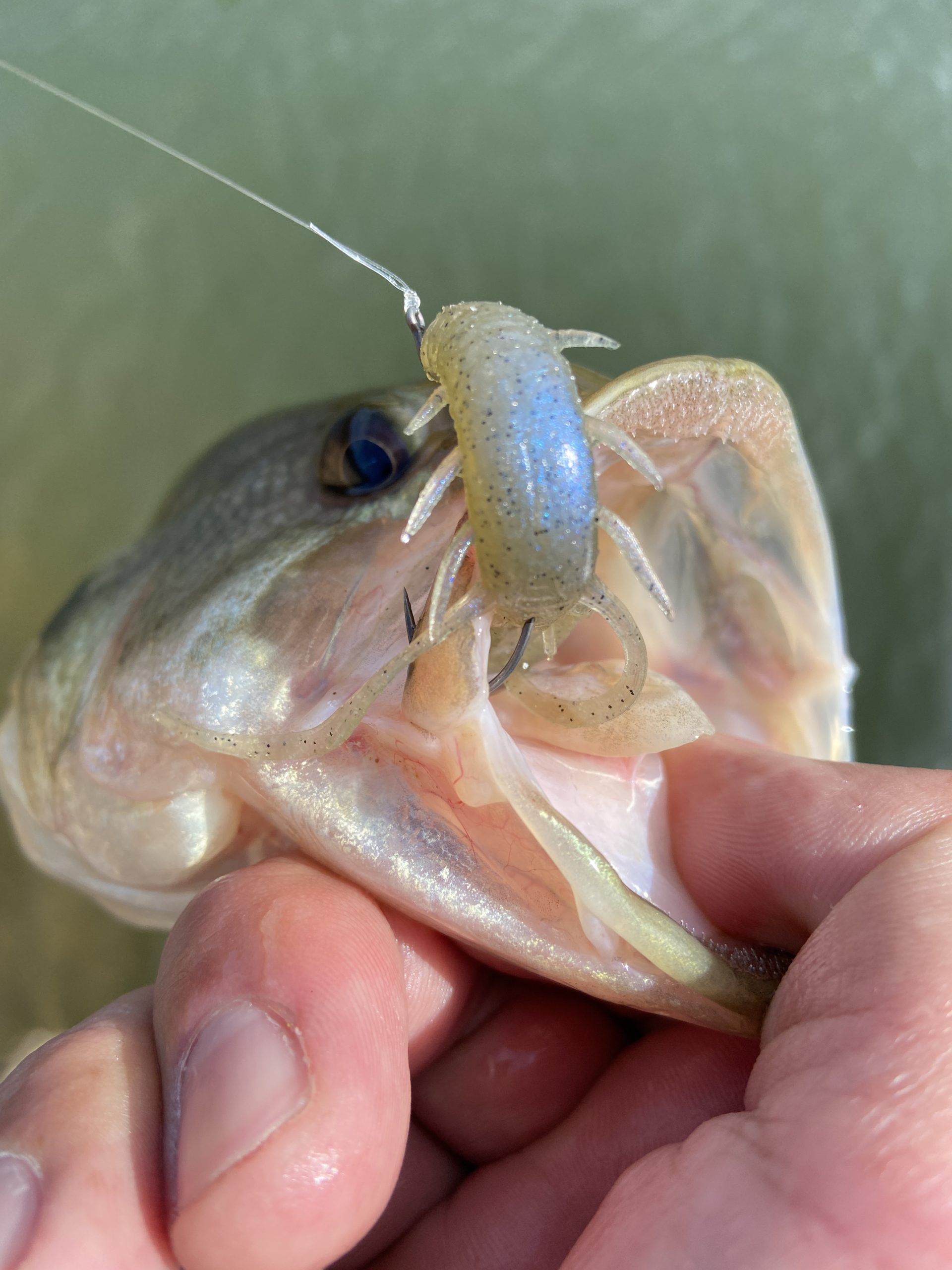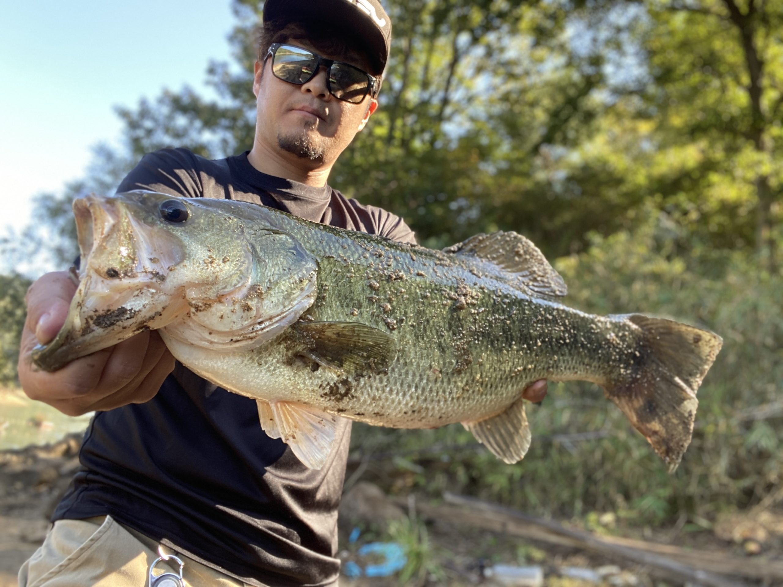 とまぁ、ゆっくりブレイクから上げて、落としてを3回くらい?ほんで、ハードボトムにひっかけて2回しゃくる。バトルホッグは倒れ込みの後に食ってくることが殆どなので、しばらくラインをたるめて放置っす!