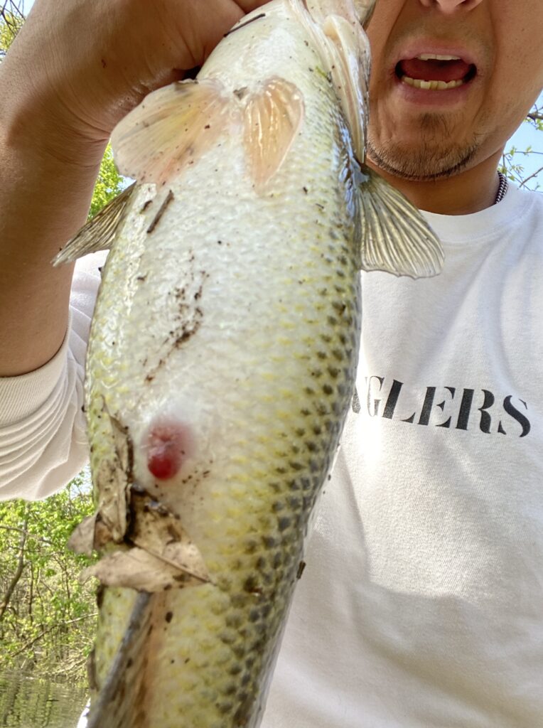 前回の記事でも書いてますが春は午後からです。大きくポイントを間違えなければ、基本的にバスと出会えることが多い時期です。幸運にも水質はステイン系、偏光レンズはタレックスのラスターオレンジ。曇りの天気や水質が悪い時にはおすすめのカラーです。