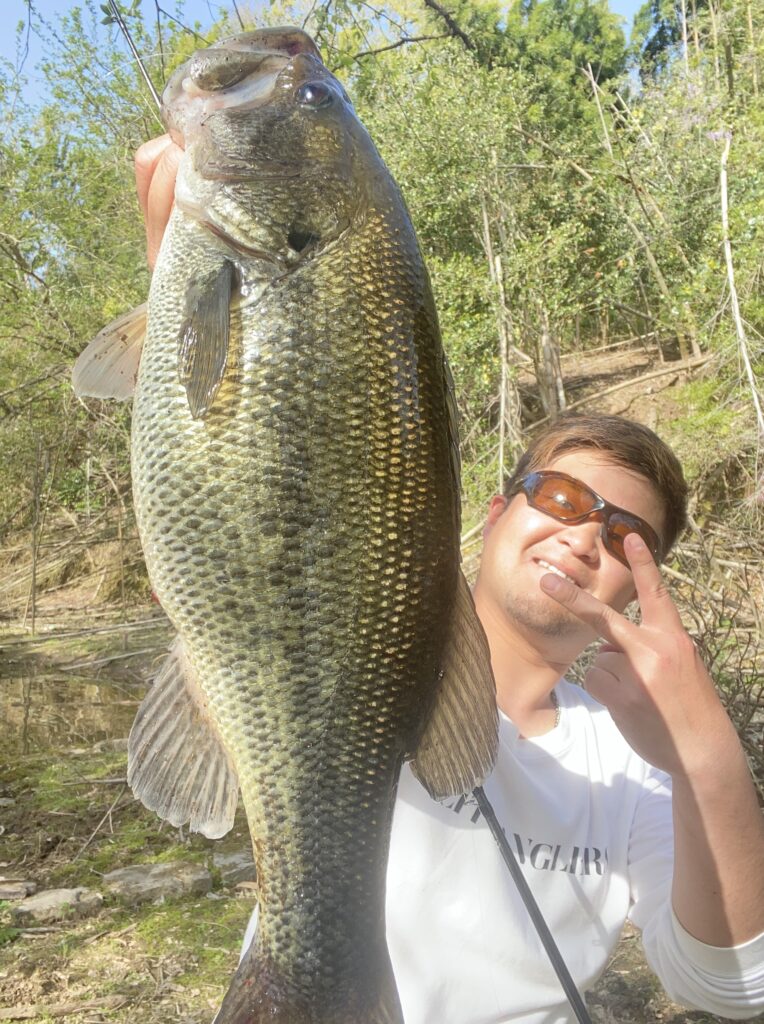 見えるレンジ(1m以内)では絶対に口を使わないので、ちょうど見えるか見えないかのレンジ(1.5m)+段々畑の石垣にジグを吊しシェイク。バスは自分の姿の見えないレンジで、尚且つ壁で僕が見えない。地形の変化を利用し簡単に口を使わすことが出来ました。深いバイトでガッツリです