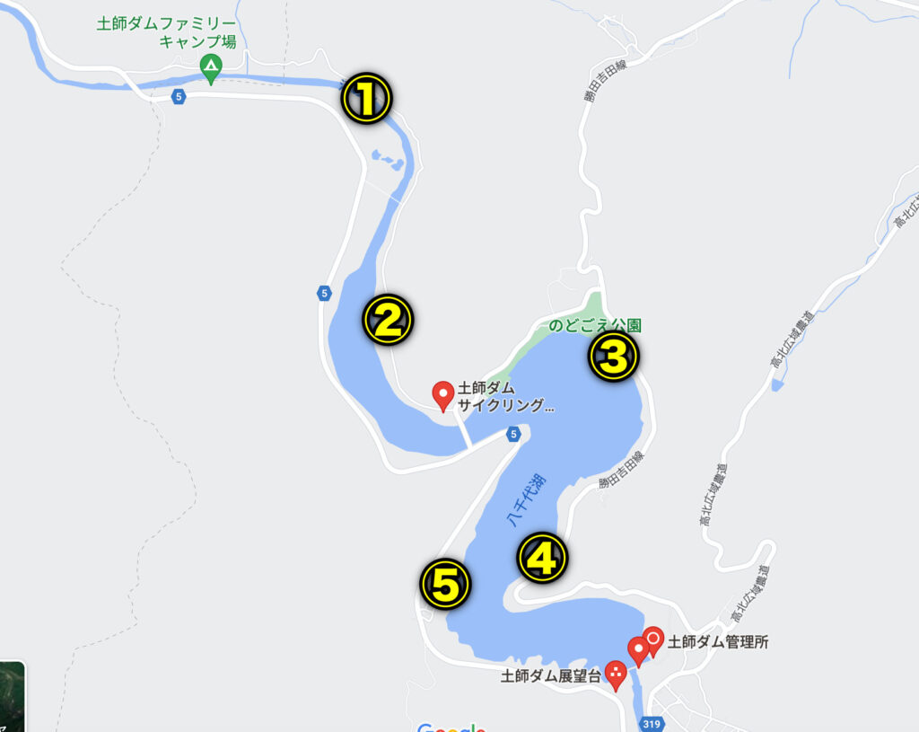 その他のポイントも脇道に駐車できるスペースがあり、想像以上に釣り場へと降りることが可能。水位的な問題もあるかと思いますが、通年の水位なら①〜⑤が土師ダムのポイントになると思います。