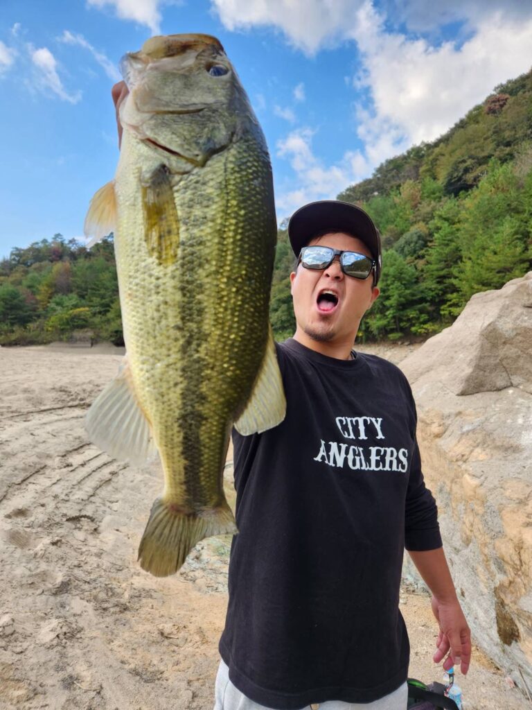 湖面には誰1人いませんが、「どりゃあぁ〜〜〜〜〜〜〜〜!!」って叫んじゃいました。側から見れば「こいつ〇ャブ食ってんのか?」って思われそうですが、2023年で最も嬉しかった魚なのは間違いないです。サイズは50に若干届いてないと思いますが、サイズじゃないところに喜びを見出せるのもバス釣りの魅力ですよね。