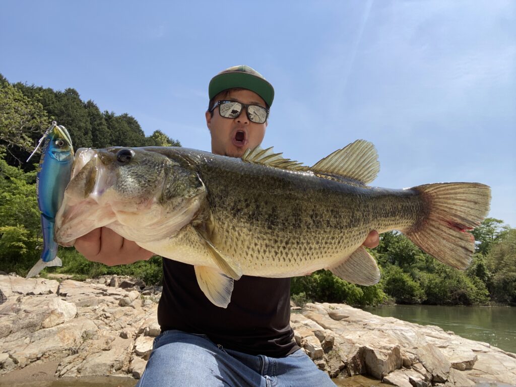 小場所なだけに慎重にエントリー。激流なので、魚のついている場所をイメージしながら、流れのヨレにから壁際にルアーを誘導。ちょうど岩盤の壁にルアーを追い込ますと、下から急浮上。一瞬、ナマズ?かと思いましたがバスだったのでワンジャーク。水面に追い込み反転。