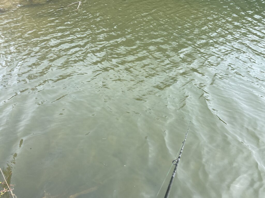 数日前に降った雨の影響で、通常の水質よりも濁っています。本当ならフルサイズのジグをポンポン撃っていけば、展開も早いと思うのですがジグ竿は車の中...取りに行くのが面倒なので、ベイトフィネスでまったり展開へ。