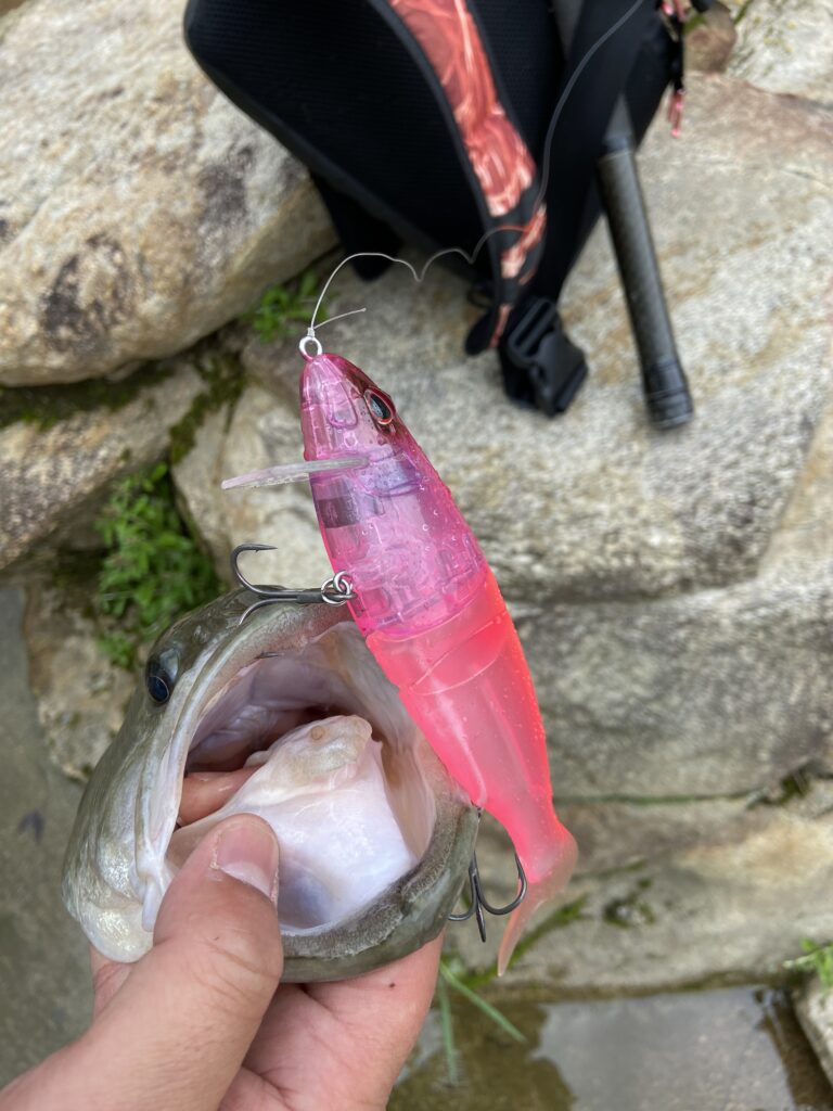 周辺を覗いてみると、見えバスだらけ。対岸の壁際を回遊するバス、口元わずか数センチに落とすベタピン無音ショットが決まり、フォールで一撃でした。