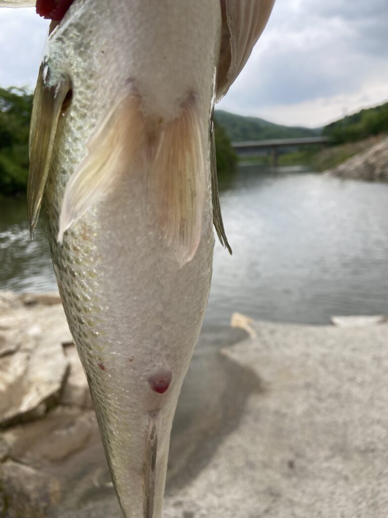 前日の大雨で一気に増水したタイミング+濁りってことで、先発は強い釣りで行きたいですが、釣果優先の「ヤマセンコー5インチ」でスタート。ちょうどインレットの脇にある岩のヨレを丁寧にフォールさせていると、2投目で35くらいがヒット。