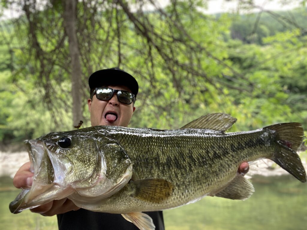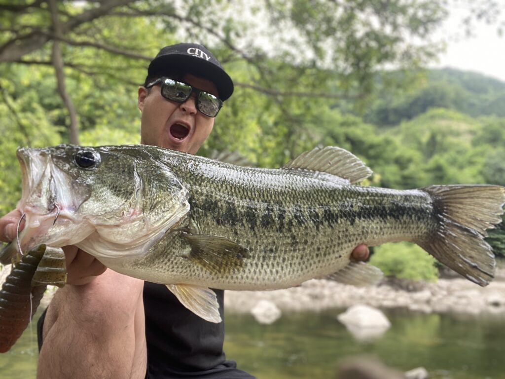 流芯の岩陰上流にキャストし、バスの目線上をゆっくりとドリフト。先日から何故かイールのノーシンカーだけ異常に反応します。流れのヨレにいるガリガリの魚なら分かりますが、流芯に居てベイトを追っかけ回している魚がこいつに反応する。