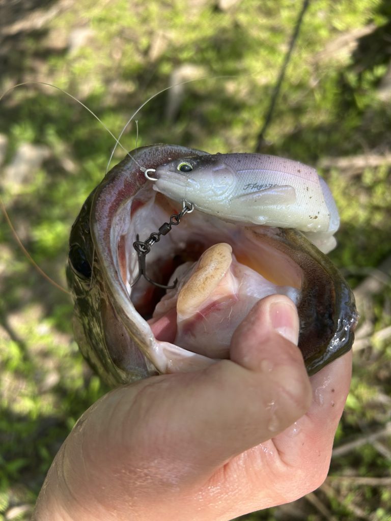 レンジ調整が難しいけど、バスからの反応はすこぶる。流芯からワラワラ湧いてくるわ、キスバイトありで、ドリフトもかなりイケてるFLAG。うっすら見える岩陰に微妙にコースを変え、アプローチしているとラインだるだるからの「ドンッ!」