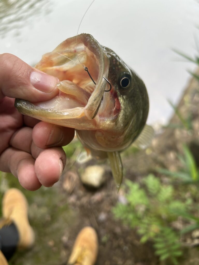 とりあえずのポジションを探るため、FLAG170で流芯へドリフト。バスの出てくるポジションとスピード感を見ながら、サクッと流す。思った以上にスピード感もあり、活性も高そうなので、ゲンゴロウワームをセットした2.7gDSをバスの出てきたポジションをドリフトすると、1投目でひったくるようなバイト