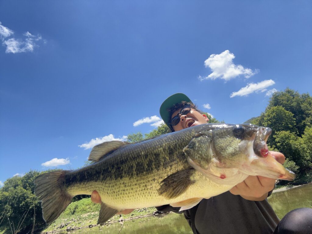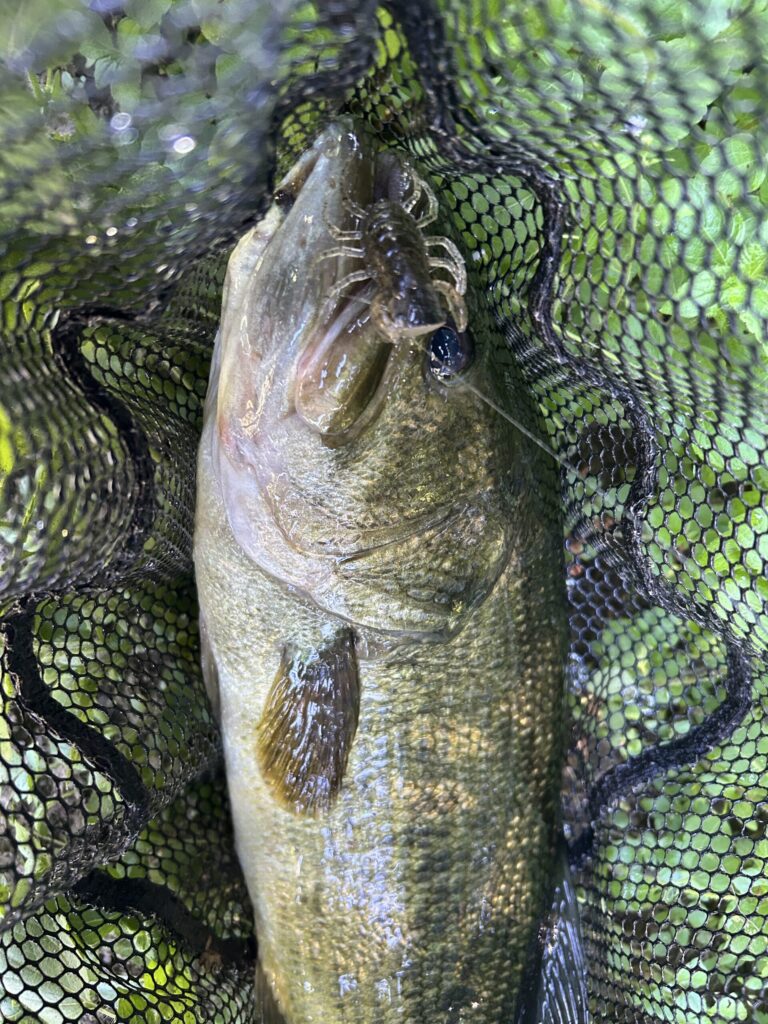 周りを見渡すも、全然バスが居ません(汗)てか、全体的に生命感がない...なんて思ってたら、下流から1匹のバスが上がってきました。バゼルからオリカネムシに変更、上流からドリフト気味に配膳してあげると、パクッと一撃。