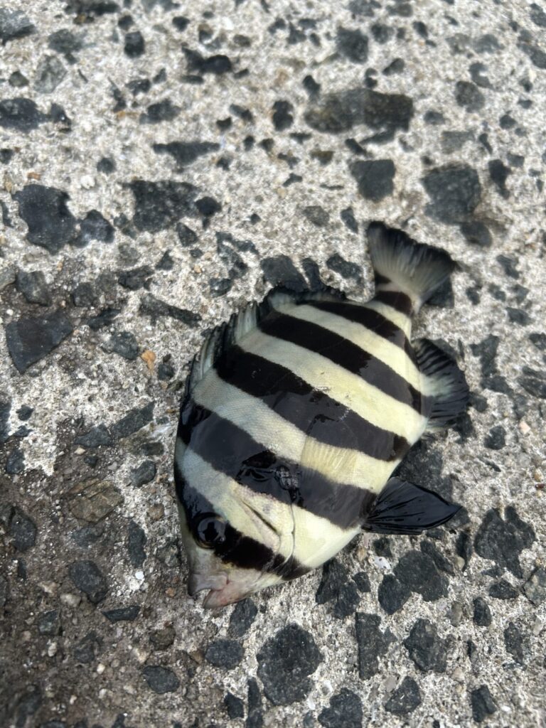 常夜灯も点き、ようやくスタート。早速5カウントでバイトがあったと思ったら、あまり見慣れない「イシダイ?」が釣れ...なかなか当たりが貰えない状況が続き、19時前に待望の当たりが「コンッ」