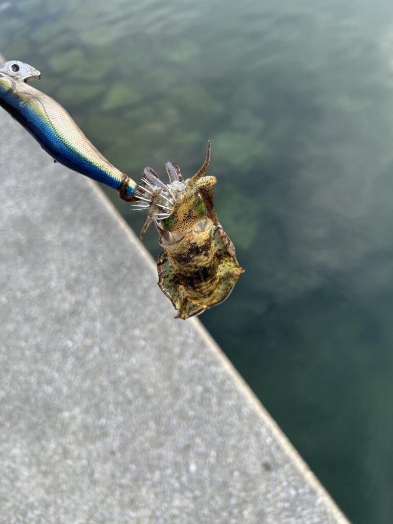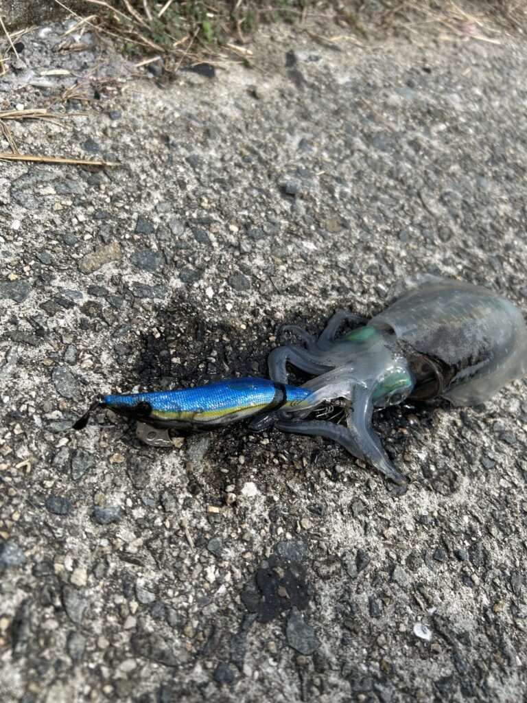 前日タックルベリーで仕入れた200円のエギを結び、シャローエリアからサーチ。ベイトも多く溜まっており、1投目で待望のアオリGET!