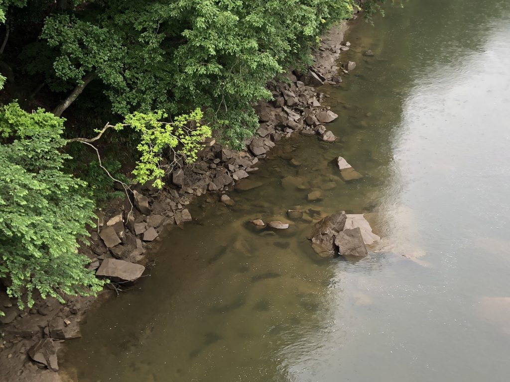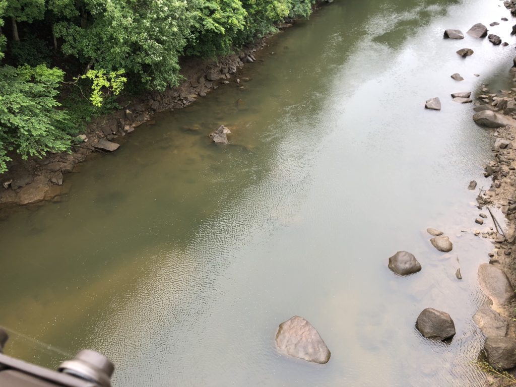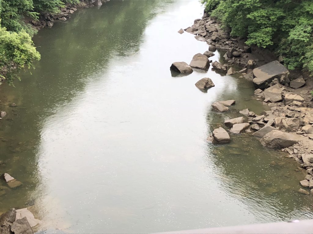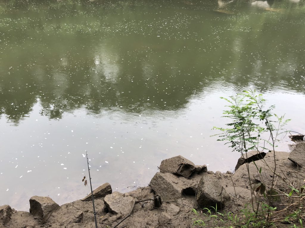 プラグの釣りからスローダウンし、昨日反応があったウィップのネコリグを流れの当たる側、流れのヨレに入れていくが反応がないため、バスのポジションを知るためにもジョイクロ148をぶち込むと、手前にうっすら見える岩から50アップがチェイス。