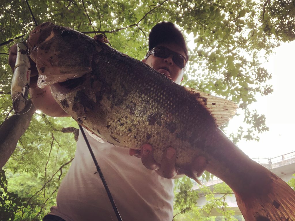 橋下の落ち込みでボイルが発生している為、ベントミノー86をキャスト。フィーディングに入っていたバスがバイト。50くらいでしたが、ジャンプ一発でバラす。