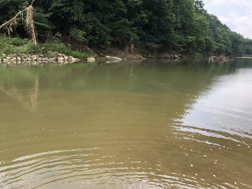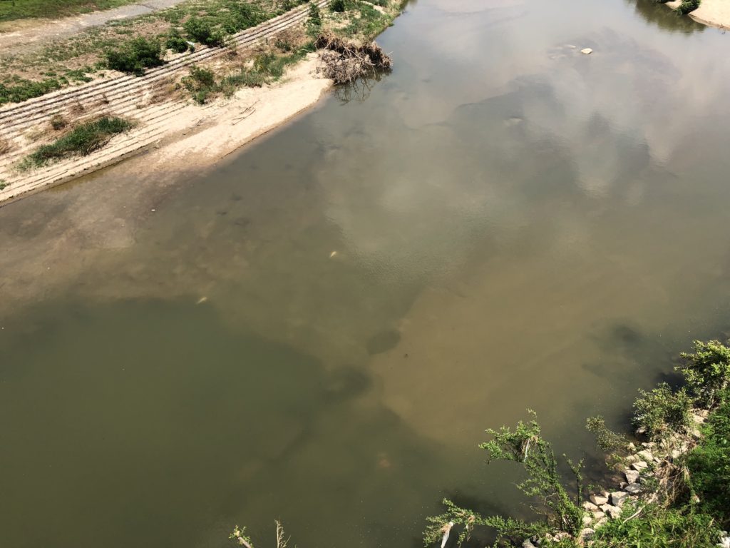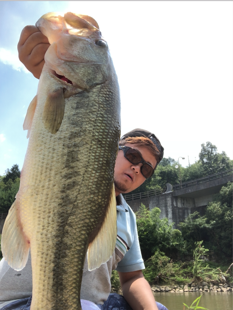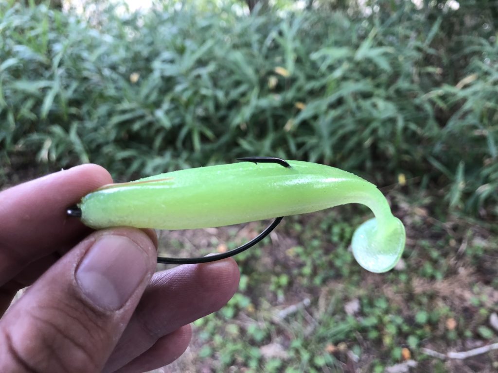 三原虫に少し反応を示すがバイトせず、少し下流に移動。レベルシャッド、ウィップクローラーで子バスを数匹キャッチ。たまに大型バスのスクールが現れる。