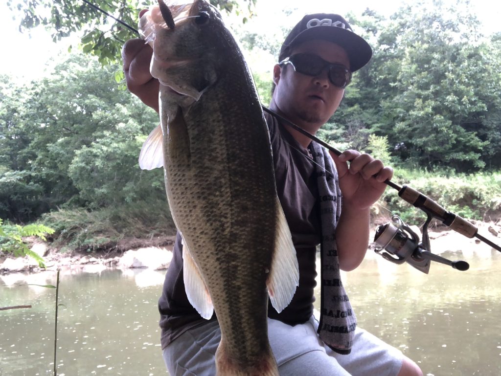 釣り場に降りた瞬間、数本のバスを発見。すかさず、三原虫のドリフトでアプローチすると即バイト。サイズこそ50はないが、よく引いたバス。