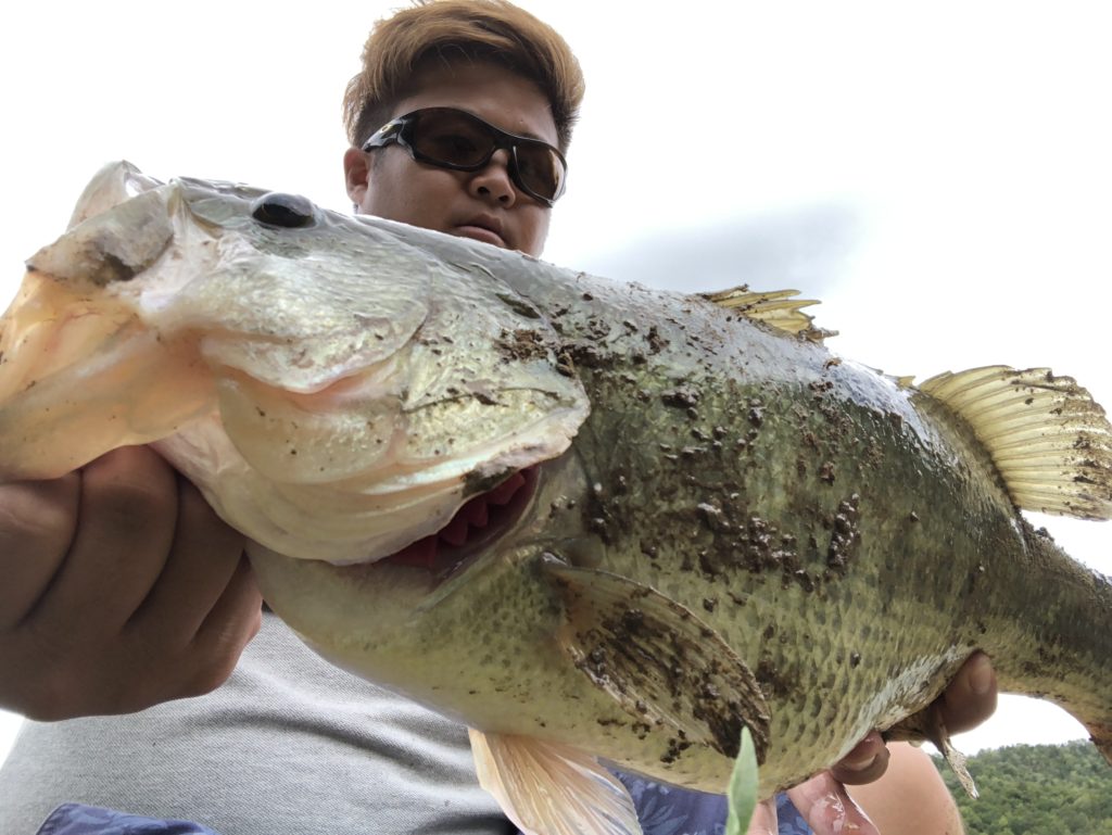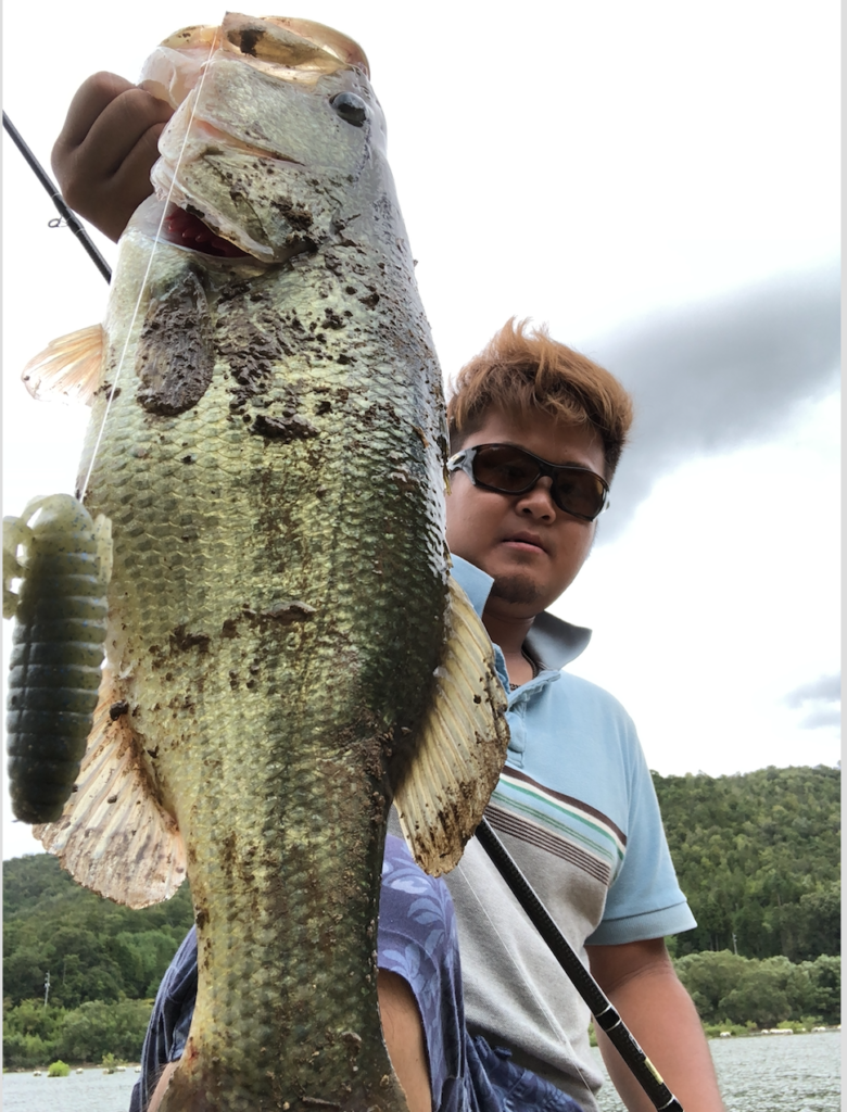 ワンド状になったエリアには、大岩や流木などのストラクチャーが豊富。到着後、ど真ん中に沈む流木の下流側にブルフラットのテキサスをアプローチ。