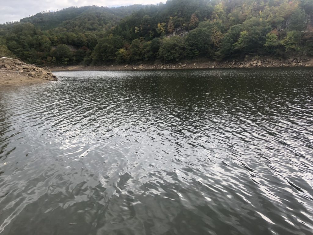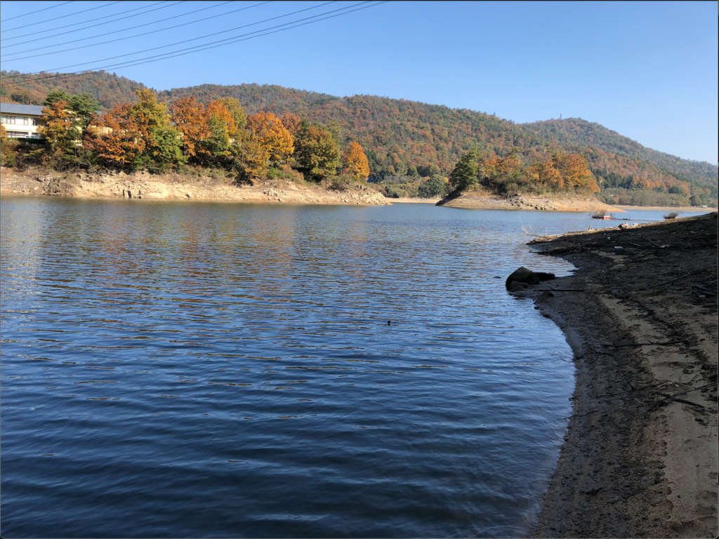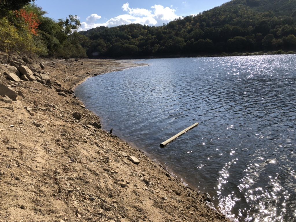 前回釣行よりも貯水率が落ちていたので、朝一は上流部へ。