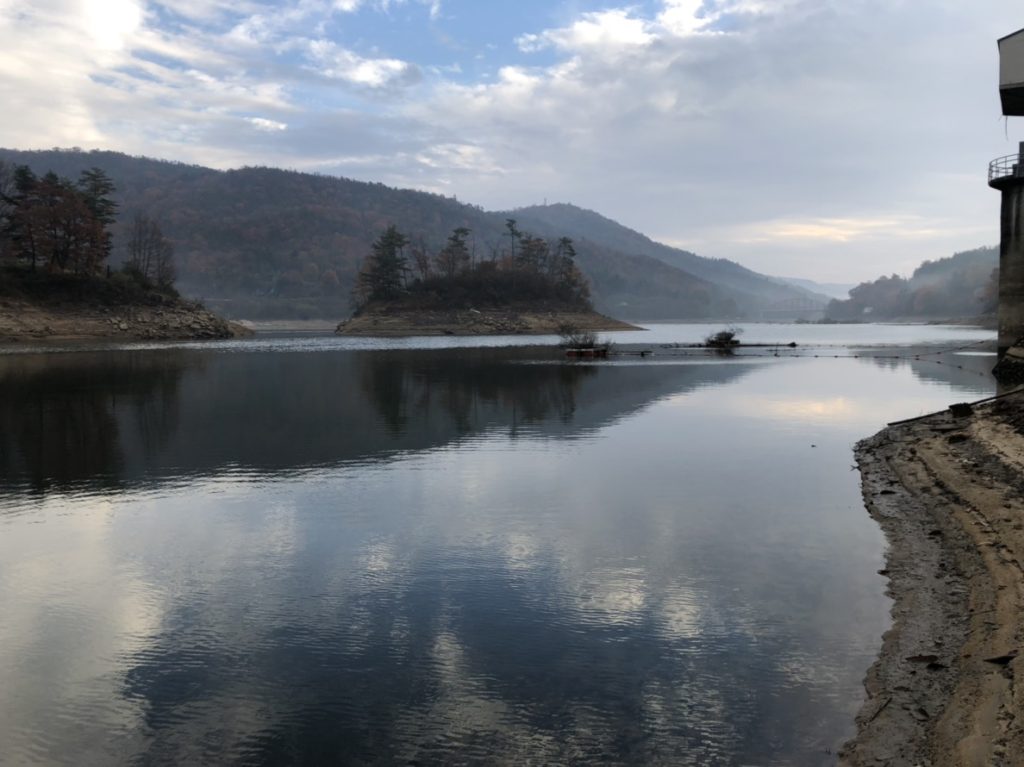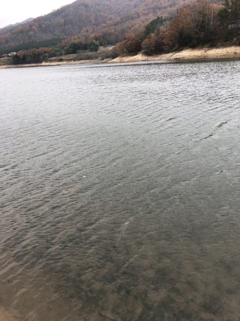 今の白竜湖は、災害の影響で流れてきた「がれき」の撤去で、バンク沿いではショベルカーやトラックなどが動き回っていた。おそらく来年の春先には水位が戻るはず。