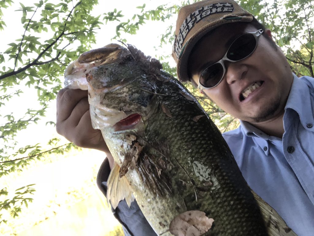 倒木の周りを雄バスがウロウロ、沖からたまに雌バスが入ってくるという状況。ワッキーのノーシンカーやスモラバで攻めるも一切興味を示さずブルフラット3.8インチのノーシンカーを倒木にフォールさせると激しくバイト!!!!!