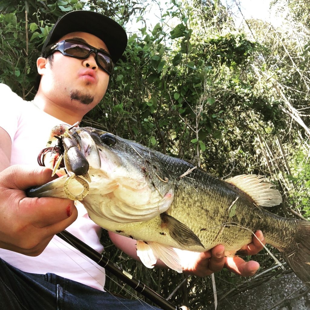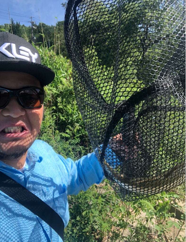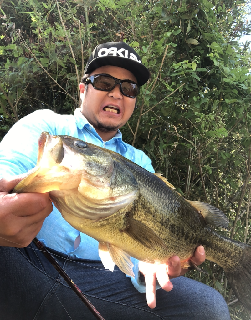 流心から外れた流れのヨレをチェックするも反応なし。ということで、お昼を食べ、東広島の河川へ移動。早速、いつものオーバーハングにバスを発見。スモラバをアプローチしてバイト。