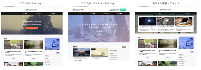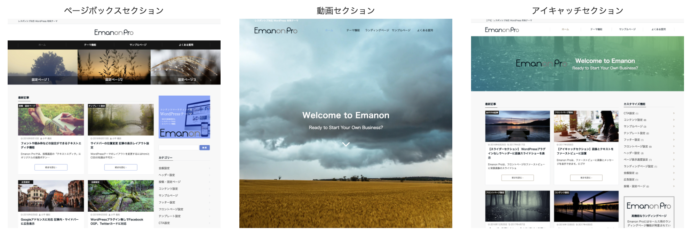 このEmanon Proでは、Webサイトの印象を決定づけるファーストビューは6タイプあります。そして、直感操作で簡単に設定することができ、Webサイトのテーマにあったデザインにすぐ変身させることが出来ます。