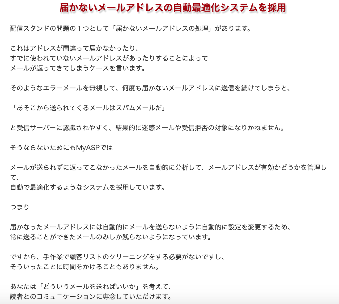 このマイスピーは、「現在広く使われている配信スタンドの良い部分だけをチョイスし、悪い部分を排除したオールマイティーな配信スタンド」だと自負しています。一般の業者では、一ユーザーからの要望を伝えたところで、そっけない回答が返ってくるだけでしょうが、それでは納得できない部分もあると思います。例えば、使っていてメールが届きにくくなった場合、たった1%到達率が落ちるだけで売上が何百万円と変わってしまう会社だって存在しますし、何よりもあなたとお客様との連絡が取れないという環境がいかに機会損失を生んでいることか。メールは今やはあなたとお客様を結ぶ大切な連絡手段の1つです。不可能だから・・・といってそれなりのものを提供するのではなく、あえて到達率100%を目指し、なおかつ誰にでも簡単に使っていただけるような最高の配信スタンドを提供したい。そう思ってから1年以上たった今日、やっとあなたにお伝えすることができました。この1年間、数々のテストと修正を重ねながら、誰もがストレスなく使えるような配信スタンドを製作してきました。少しプログラムが出来る人なら分かると思いますが、実は、ただメールを送るだけのプログラムなら、比較的簡単に作ることができます。しかし配信スタンドとなると、「ただメールが送れればいい」という簡単なものではありません。使用する人がどんな機能を望んでいるのか従来の配信スタンドでどこが使用者のネックになっているのかどうすればメールの到達率を1%でも上げることができるのか作ってはテストして、修正箇所を見つけ、またテストする・・・。そして公開前の最終チェックとして、実際に配信スタンドを普段から利用している経営者の方々に使っていただき、修正箇所や追加して欲しい機能、いらない機能などの感想を聞いて何度もバージョンアップを重ねてきました。こうして、1年という長い年月を元にして製作した配信スタンドが・・・「MyASP(マイスピー)」なのです。