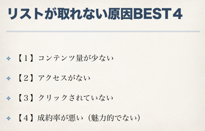 取り方を学ぶのではなく、「取れない原因を知り」→「その原因を改善する」からリスト取りが上手くいくようになるのです。しかし、みんな原因を探ろうとしないんです。