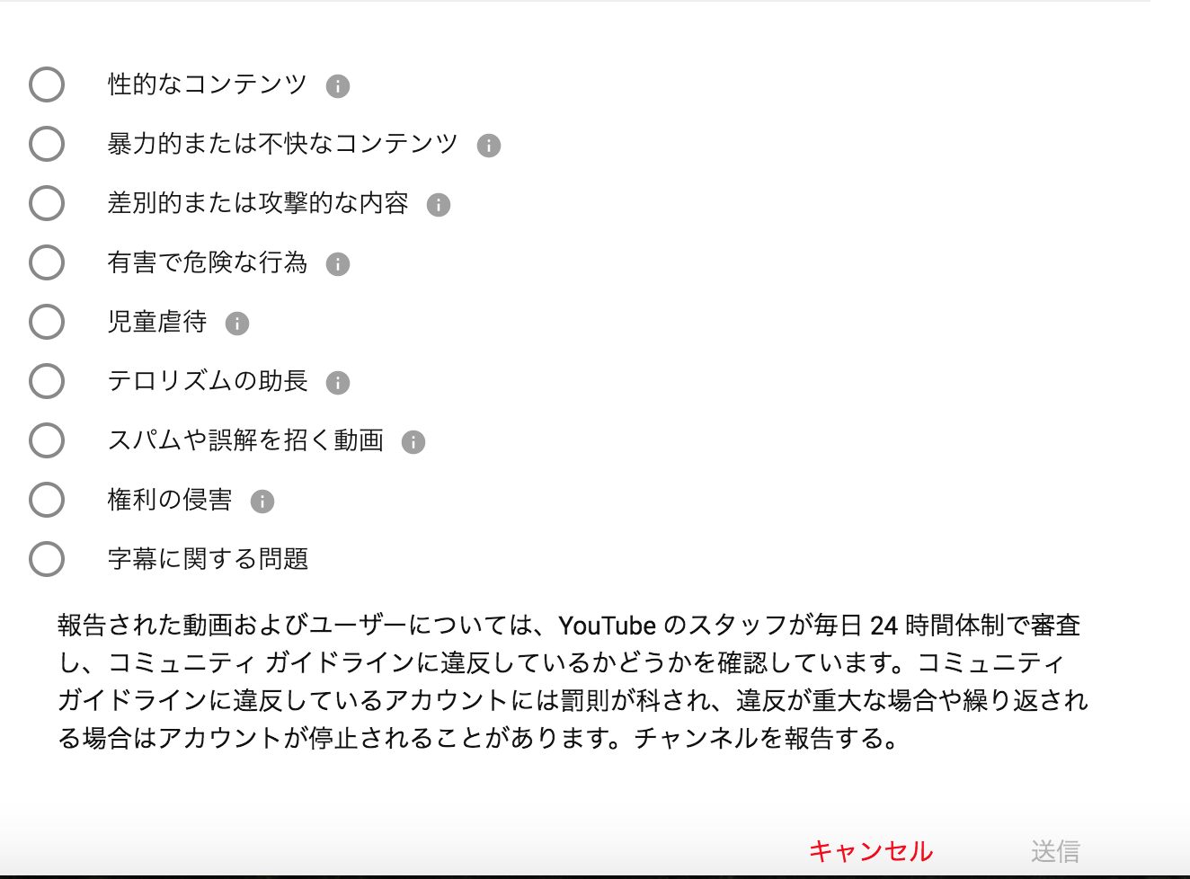 上記にある「コミュニティーガイドライン」が出てくるのです。そこで、左にあるチェックマークをクリックし、【送信】するだけで、違反報告ができちゃうわけです。